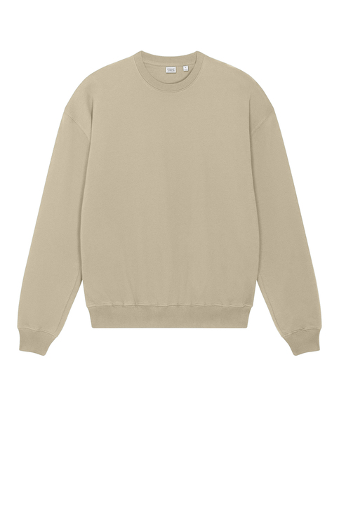 A boxy crewneck with a dry hand feel. The unique character of organic cotton French terry provides a perfect place for a brand logo.